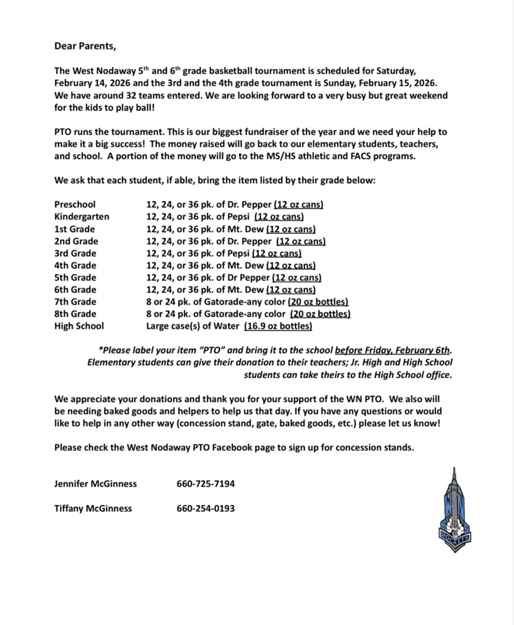 PTO is requesting pop, water or Gatorade from all PreK-12 grade students for their upcoming tournament. Please send your items to either office by Feb. 6th.
