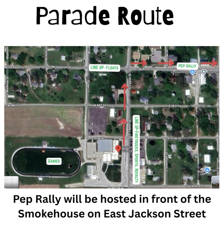 The parade will begin at 1:15 pm with the pep rally to follow. See the locations below! 🏈